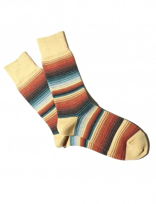 Elevate your daily rotation with the Anonymous Ism Sarape Crew Socks in Mustard. These socks combine traditional Japanese manufacturing with a vibrant aesthetic, featuring a rich mustard yellow base accented by a classic multi-colored sarape stripe pattern. Perfect for adding a sophisticated pop of color to both casual shorts and tailored trousers.
