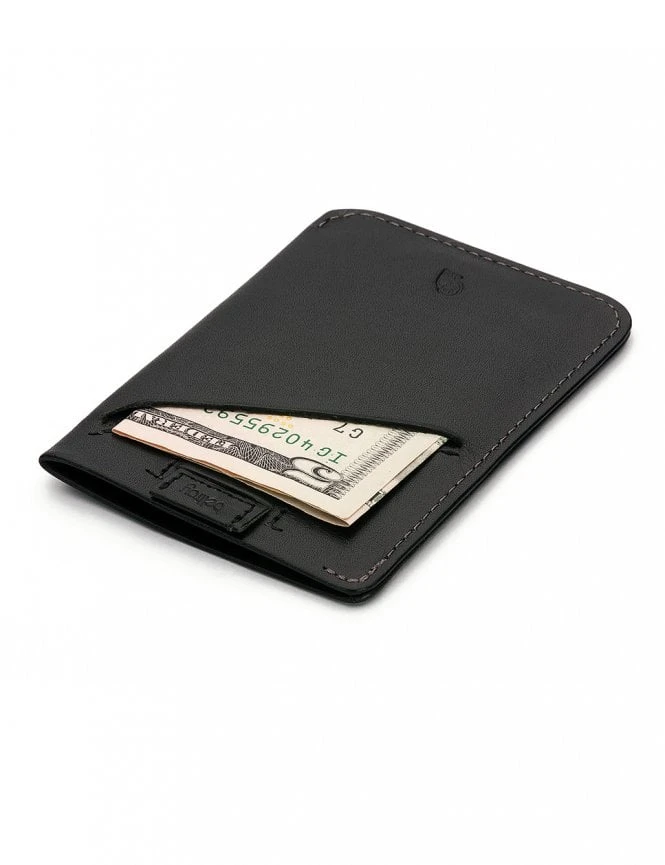 Crafted from premium, eco-certified black leather, this wallet features a smooth finish with tonal stitching and the iconic debossed Bellroy owl logo. The design includes quick-access slots on the exterior for your most-used cards, while the main interior compartment utilizes a pull-tab mechanism for easy access to stacked cards and folded bills.