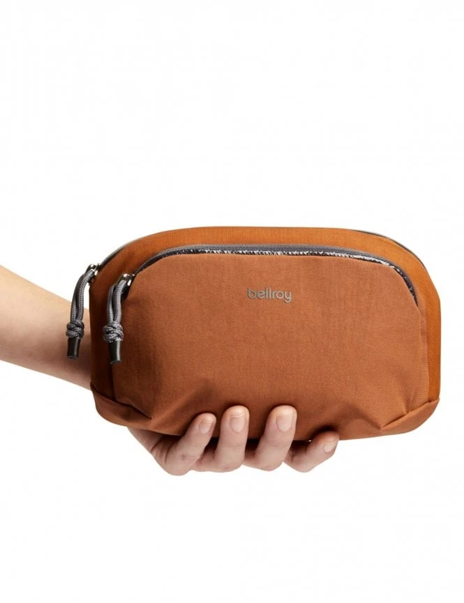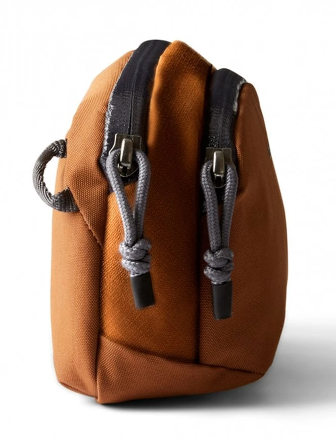 The Bronze colorway offers a sophisticated, earthy aesthetic that complements any outdoor or casual outfit. The pouch features a clean, streamlined silhouette crafted from high-performance, water-resistant recycled nylon, accented by discreet Bellroy branding and premium weather-shielded zippers.