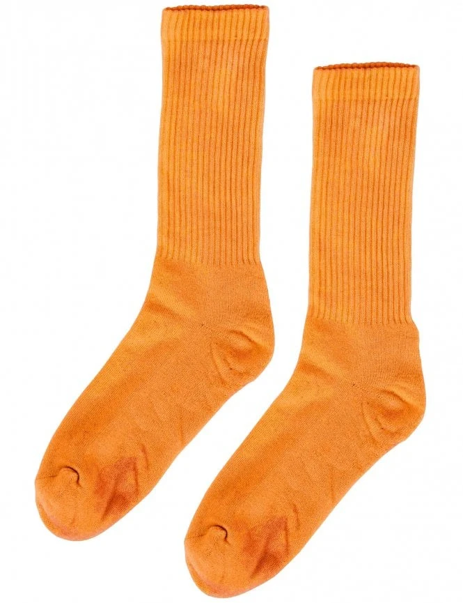 These socks feature a vivid Sunny Orange hue, meticulously achieved through eco-friendly garment dyeing processes. The silhouette is defined by a classic high-ribbed texture on the leg for a secure, sporty fit, contrasting with a smooth, cushioned footbed for all-day comfort.