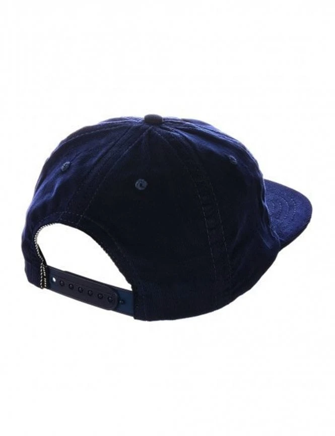 This hat features a rich navy blue corduroy fabric that provides both durability and a tactile, high-end finish. The front crown is anchored by a high-contrast yellow ‘Dark Seas Division’ script patch, adding a bold pop of color. The structured profile and classic flat bill maintain a clean silhouette, while the adjustable snapback ensures a perfect fit for all-day wear.