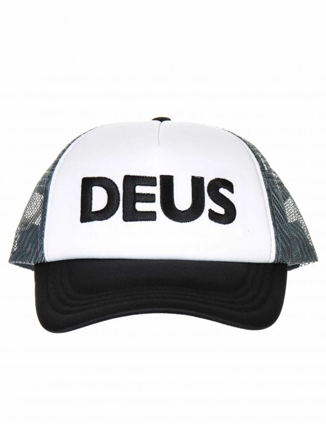 This classic trucker features a bold black front crown and bill, perfectly balanced by a high-contrast grey mesh back for maximum airflow. The signature Deus wordmark is prominently displayed on the front panel, highlighting the brand’s heritage in custom motorcycle culture.