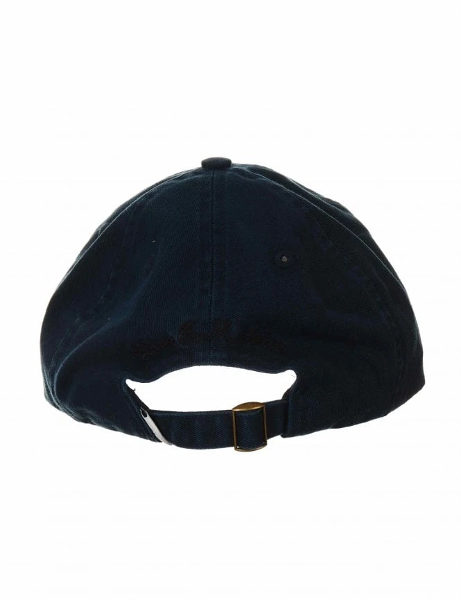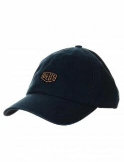 Crafted from premium cotton twill, this cap features a deep navy blue crown and visor, providing a versatile, understated look. The focal point is the iconic Deus Shield embroidered on the front panel in a contrasting white, black, and red thread, giving it that authentic vintage feel. The unstructured 6-panel design ensures a relaxed, low-profile fit that molds to your head over time.