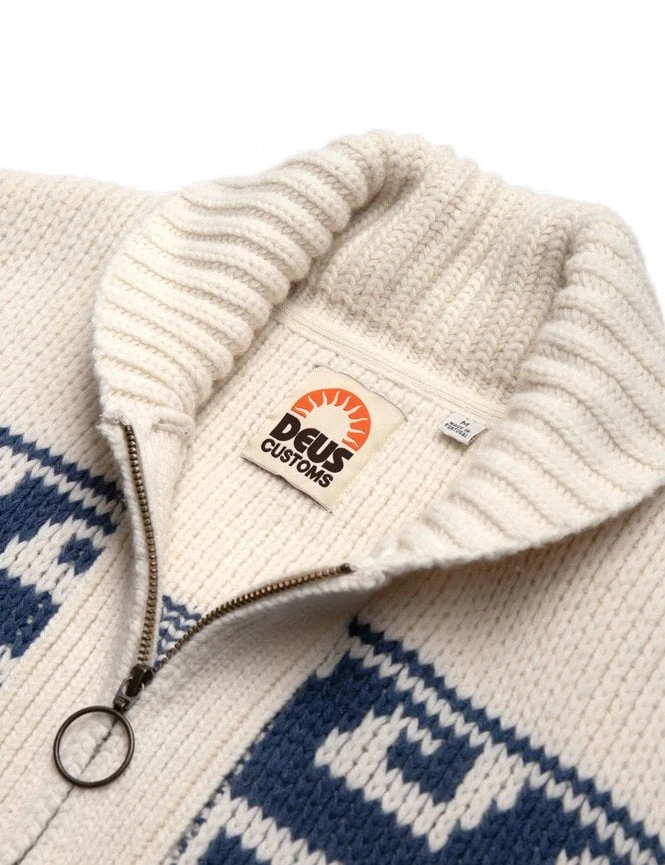Travel back in time with this 70’s style Deus Ex Machina Swell Map Cardigan. Inspired by the closets of icons such as David Starsky and Jeff Lebowski, this cardigan is made from 80% lambs wool and 20% nylon fabrics. Eyes will be drawn to the simple but vibrant jacquard pattern, matched with the classic metal ring zipper.