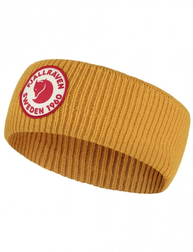 This headband is finished in a bold Mustard Yellow that highlights its intricate ribbed knit pattern. The front is adorned with the iconic 1960 embroidered logo, offering a touch of vintage heritage. Its two-layered construction provides a substantial feel without being bulky, making it a stylish alternative to standard hats.