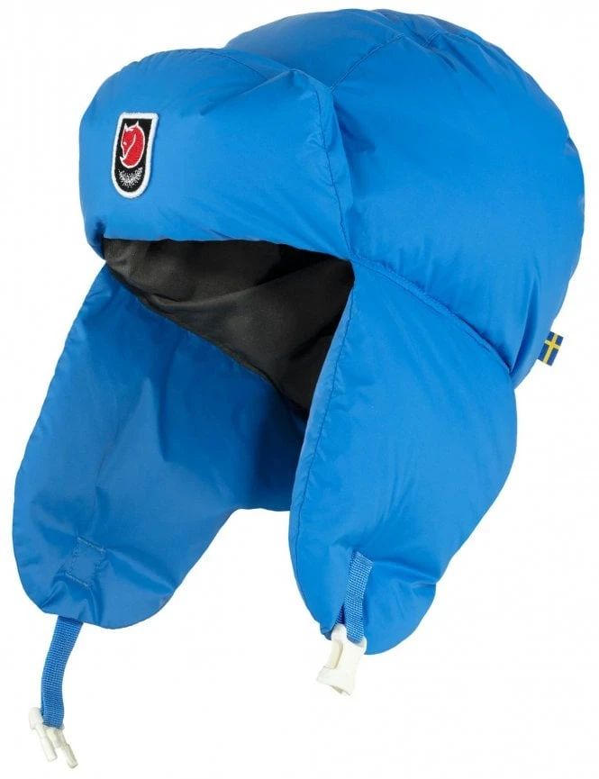 Visually striking in its vibrant UN Blue colorway, the hat features a classic quilted puffy construction that traps heat efficiently. The iconic yellow Fjallraven fox logo is embroidered on the front, signaling premium outdoor quality. The design includes extended ear flaps and a secure chin strap to ensure complete coverage when the temperature drops.