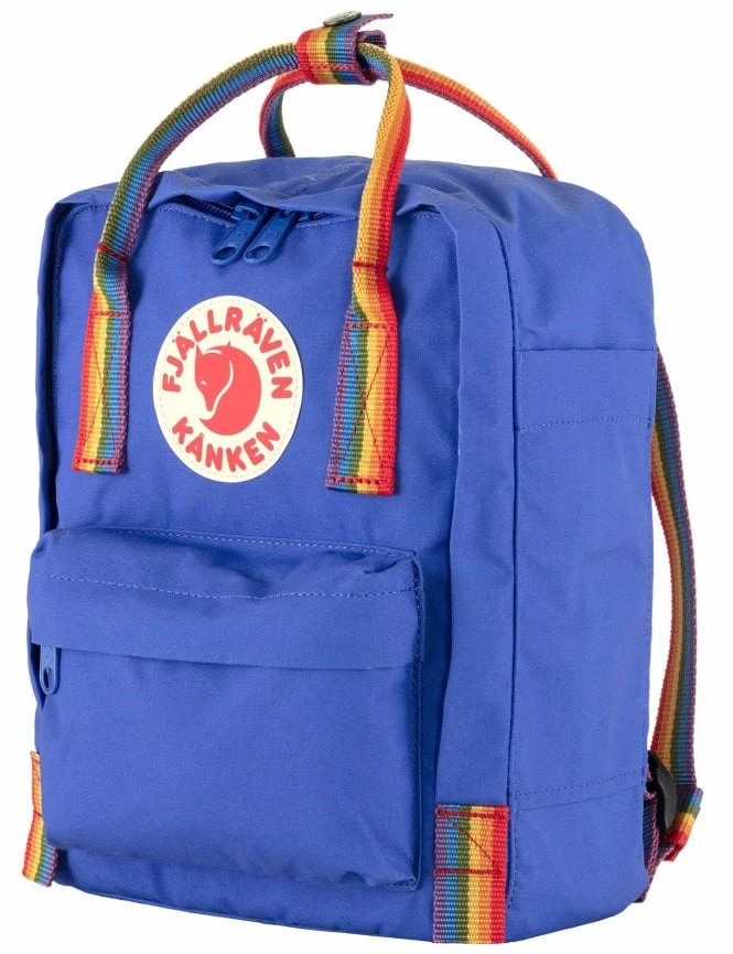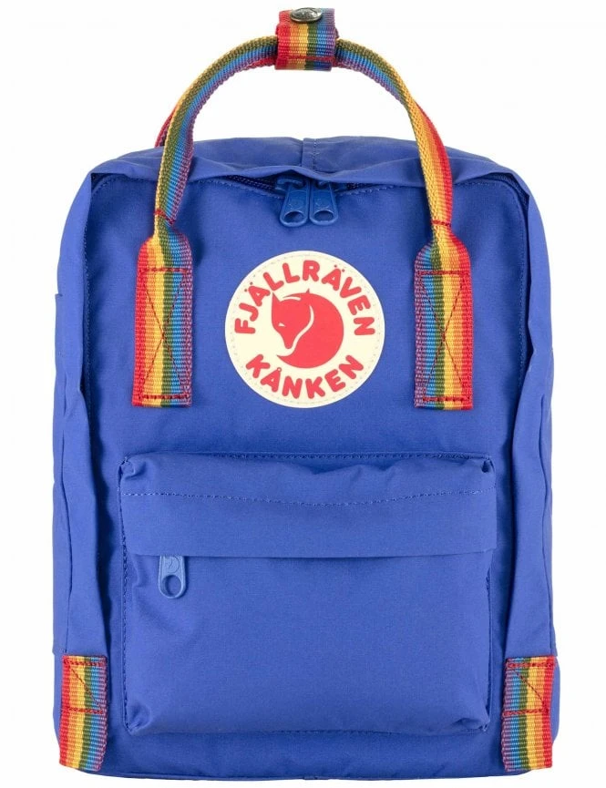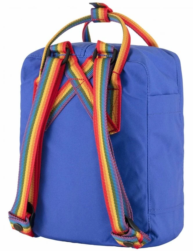 The Fjallraven Kanken Mini Rainbow Backpack in Cobalt Blue combines iconic Swedish design with a celebration of diversity. This compact version of the classic Kanken is perfect for both children and adults who want a smaller bag for daily essentials, featuring a bold blue body and eye-catching rainbow accents.