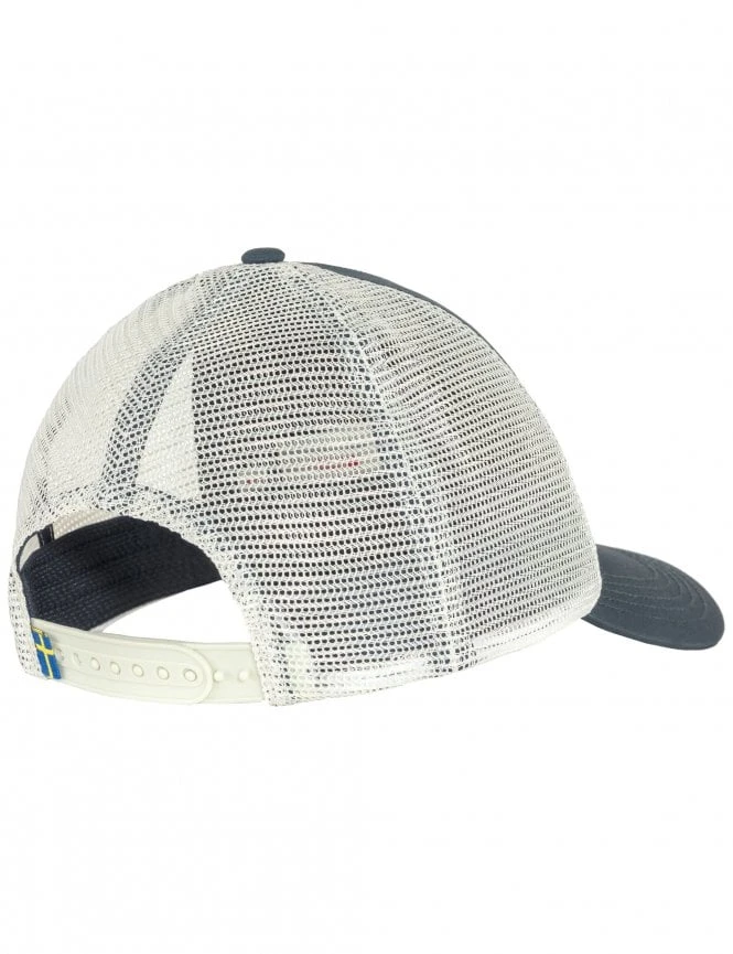 This model features a rich Navy blue front panel crafted from Fjallraven’s signature G-1000 Eco fabric, known for its extreme durability. The front is anchored by a vintage-inspired circular embroidered badge showcasing the iconic Arctic Fox. The rear sections consist of tonal navy mesh, providing a classic aesthetic and superior ventilation for all-day comfort.