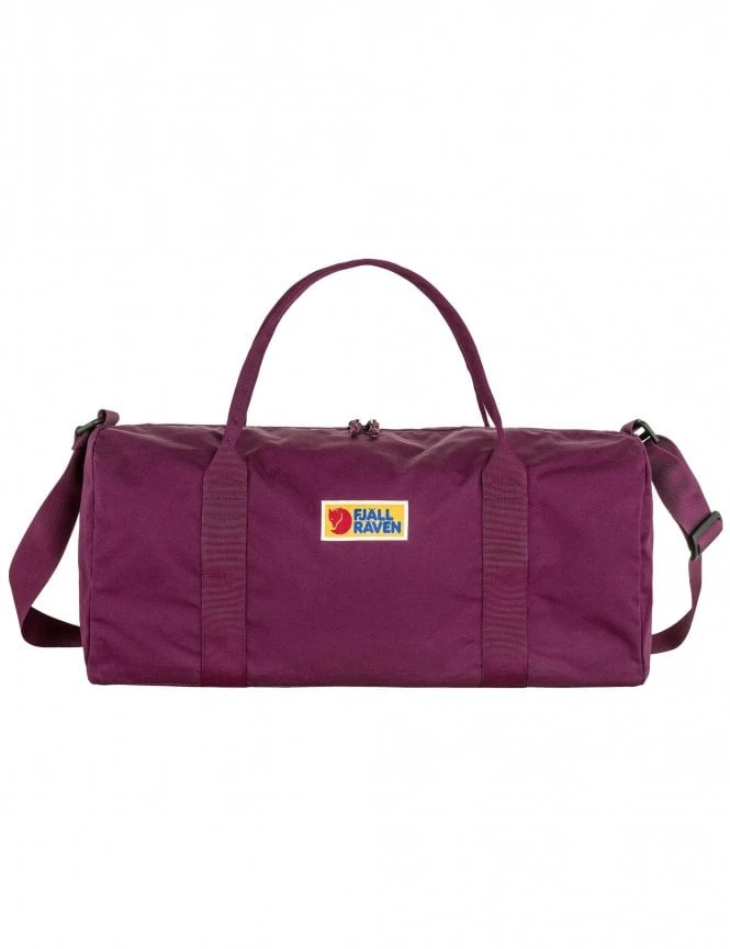 Crafted in a rich, deep Royal Purple hue, this duffel features the iconic 1970s-inspired Fjallraven logo patch prominently on the front. The exterior is constructed from the legendary G-1000 HeavyDuty Eco S fabric, ensuring the bag remains lightweight yet incredibly resilient against wear, tear, and the elements.