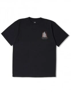 The Edwin Highest Mountain Tee in Black features a front and back print. The product has an oversized fit and is made from 100% cotton. The product contains a ribbed collar and is manufactured in Portugal.