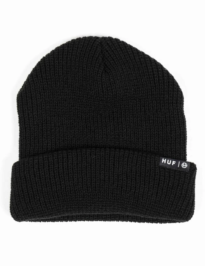 This beanie features a deep black colorway with a pronounced ribbed texture for a classic look. The fold-over cuffed brim provides extra insulation for the ears and is finished with a signature HUF twill branding label, offering a subtle yet iconic touch of streetwear heritage.