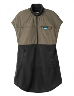 The Women’s Neve Dress in Leaf by Kavu is a half zip, casual fit fleece cape dress made from polyester and printed polar fleece. It has woven pieced front and back upper body panelling, a top entry chest pocket and zip hand pockets. It contains elastic at the back waist and elastic binding on the deep curved hem. This piece is a perfect overlayer to keep you nice and warm when out in the wilderness. However, this piece is also very unique and stylish and could be worn in any day-to-day situation where you want to keep warm but also look cool and quirky.