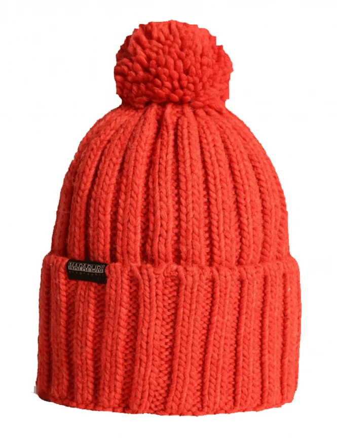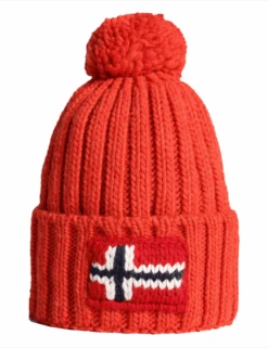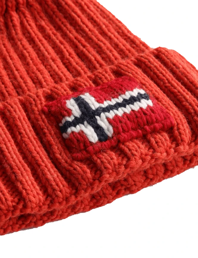 This specific model features a bold, saturated red colorway topped with a matching tonal fluffy pom-pom. The wide fold-over cuff proudly displays the signature Napapijri knit logo alongside the Norwegian flag—a tribute to the pioneering spirit and Arctic explorers that inspire the brand. The textured vertical ribbing provides both elasticity and superior thermal insulation for the coldest days.
