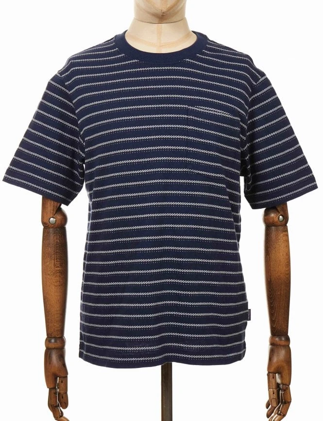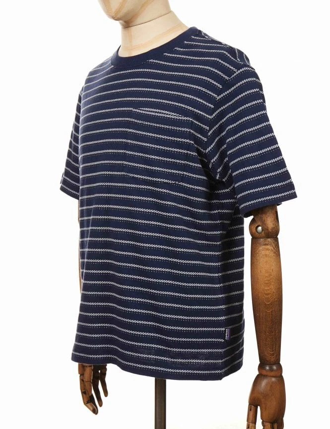 This is another classic, clean cut midweight Patagonia Organic Cotton Midweight Pocket Tee in Cordelette: New Navy  that goes anywhere and pairs with nearly anything. Constructed of 100% Organic Cotton Solid-knit jersey in solids and stripes, Fair Trade Certified.Â