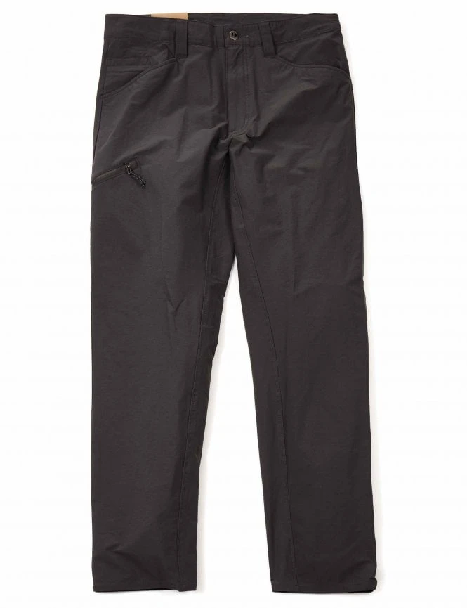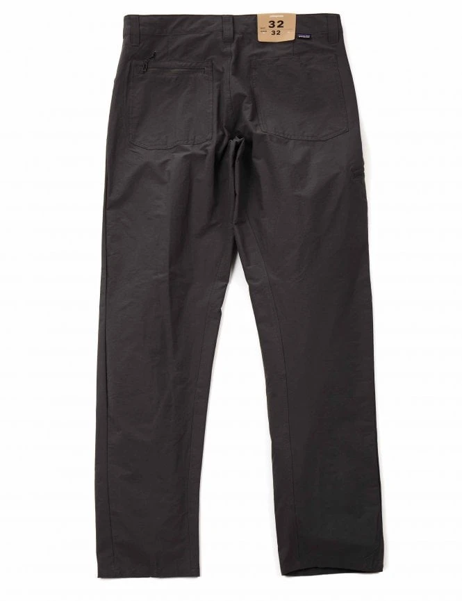 Light, technical fabric blend, made with stretch-woven 95% nylon (65% recycled)/ 5% spandex with a DWR (durable water repellent) finish and 50+ UPF sun protection. Sits on the waist with a regular rise; not too loose and not too tight in the seat and thighs; cut straight from knee to ankle. Curved waistband contours to the natural shape of the hips and provides a close fit to keep pants in place during movement; metal-button closure with zip fly.