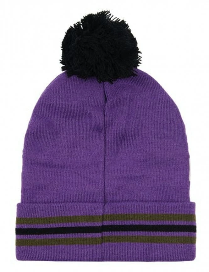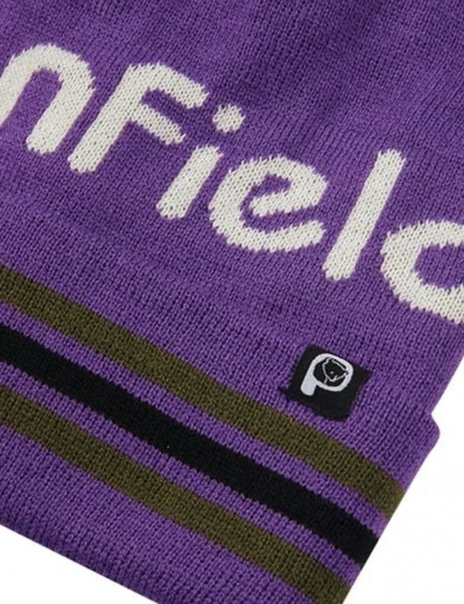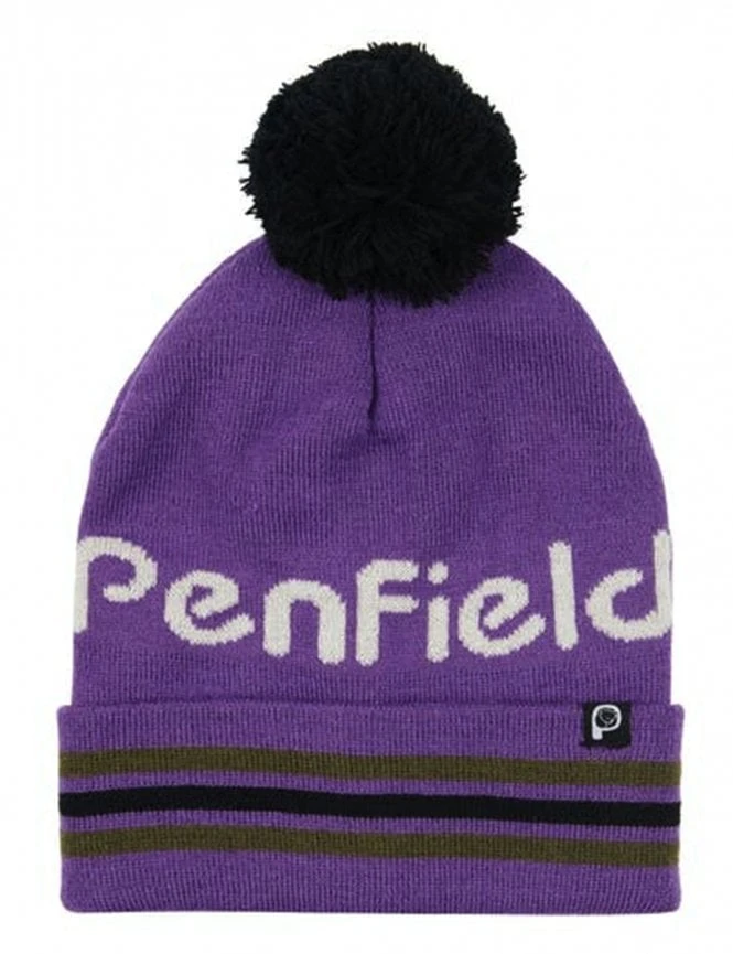 This beanie boasts a rich Pansy purple base accented by high-contrast white intarsia lettering that wraps around the entire crown. The design is topped with a plush, matching multi-tone bobble and finished with the signature Penfield ‘P Bear’ woven side tab, ensuring an authentic look from every angle.