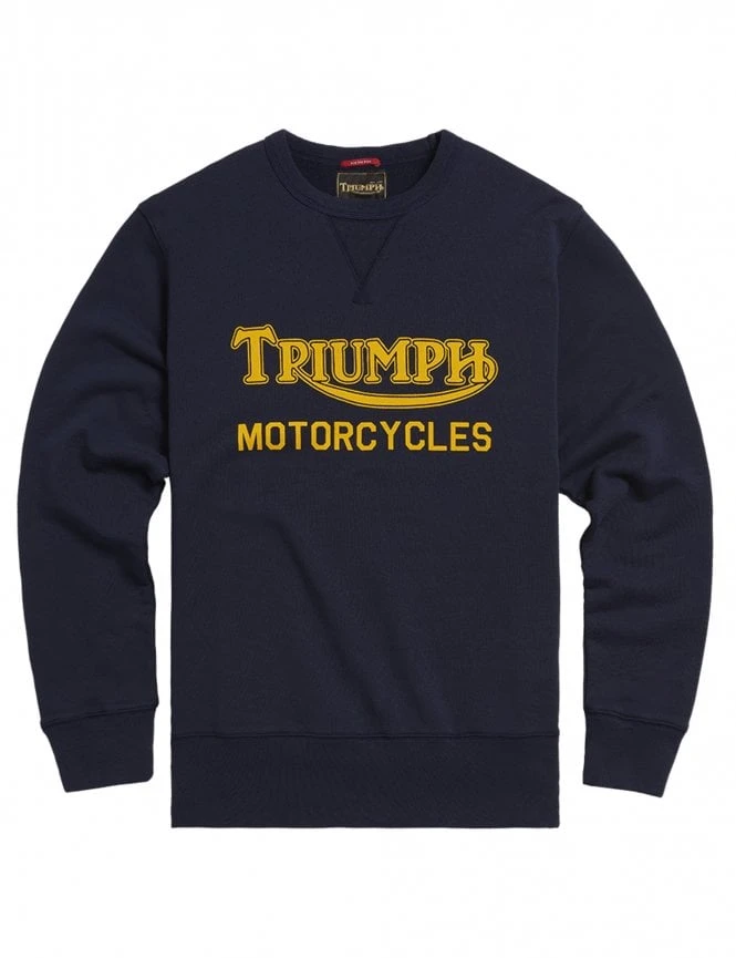 The Radial Sweatshirt By Triumph Motorcycles in Indigo/Racing Gold is a heavyweight, 100% cotton, crew neck sweatshirt. It has a classic design with a V-insert neck detail stitching and a bold Triumph Motorcycles soft touch printed graphic on the front. It has a small and subtle signature triumph branded woven label on the side of the sweatshirt. This heavy cotton sweatshirt is a thick and cosy sweater to use as a top layer itself or as an underlayer in colder conditions.Â