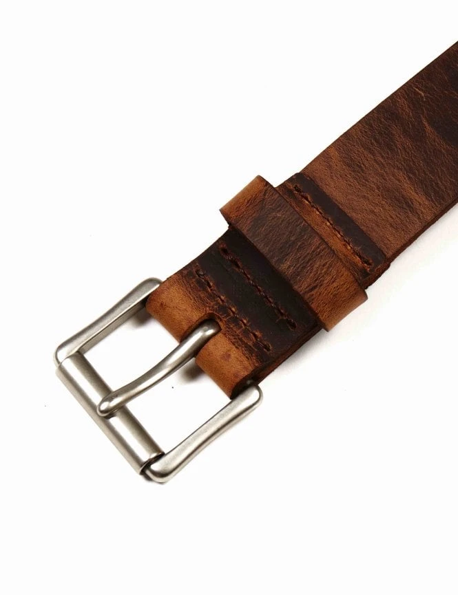 The belt features the distinct pull-up effect of the Copper Rough & Tough hide, showcasing natural beauty marks like grain variations and scars that ensure no two pieces are exactly alike. It is finished with heavy-duty solid brass hardware and precise tonal stitching for a clean, classic aesthetic that works from the job site to the weekend.
