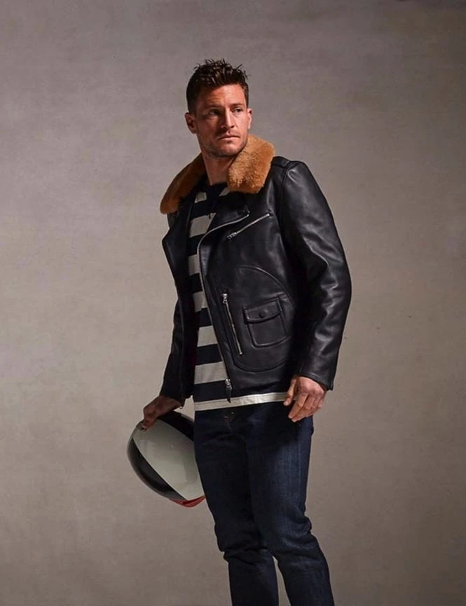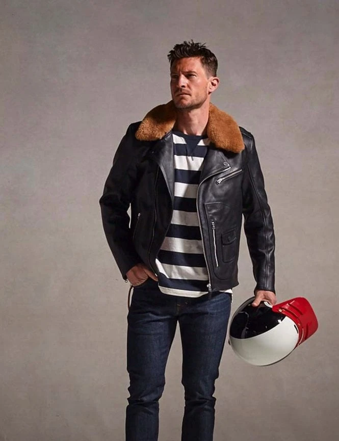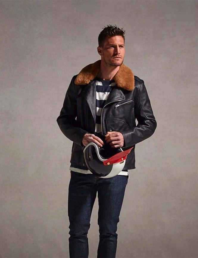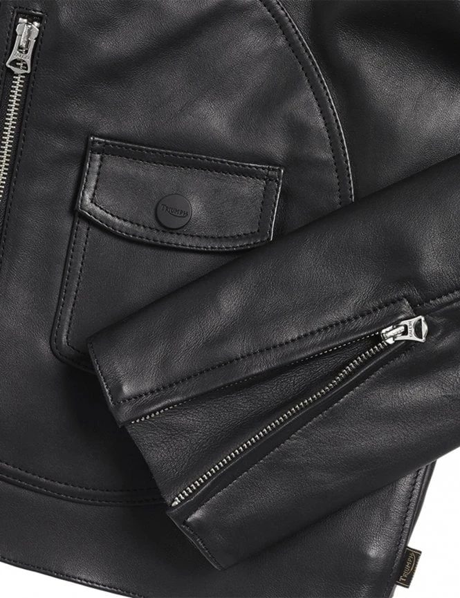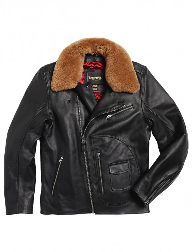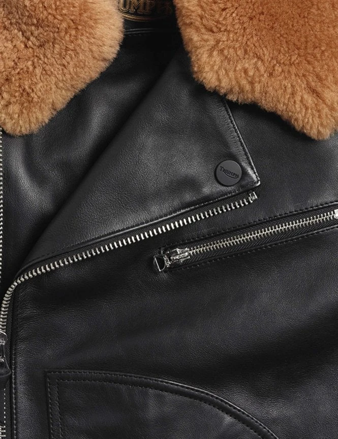 The classic Triumph Rexford Leather Jacket is a statement piece. Featuring its 100% top grain leather, asymmetrical rider style zip, heritage talon zippers, stylish D-pockets and zip opening gusseted cuffs, this iconic jacket has it all. Finished off with its shearling removable collar and quilted red satin lining, this classic jacket gives the perfect biker style you are looking for.