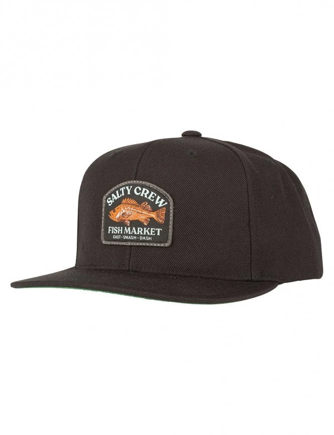This cap features a deep black crown and visor, accented by a distinctive circular fish graphic patch centered on the front. The patch proudly displays the Salty Crew wordmark and ‘Find Refuge in the Sea’ motto, celebrating the fishing lifestyle. The 6-panel structured design provides a timeless silhouette that holds its shape whether you are on the boat or on the beach.